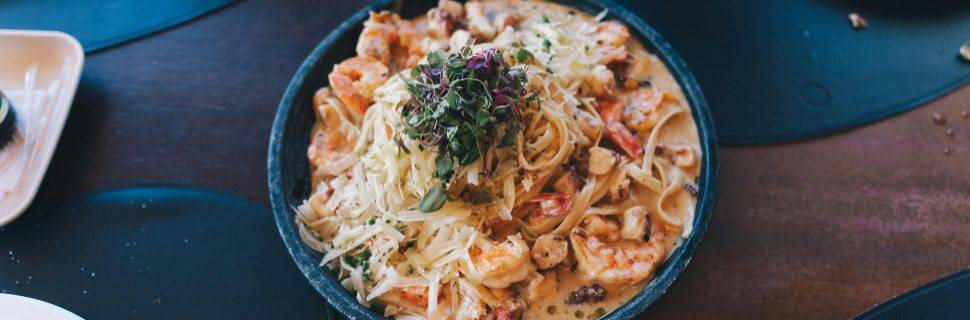 Domingo: Macarrão com camarão no queijo parmesão Grana Padano e chiclete de camarão